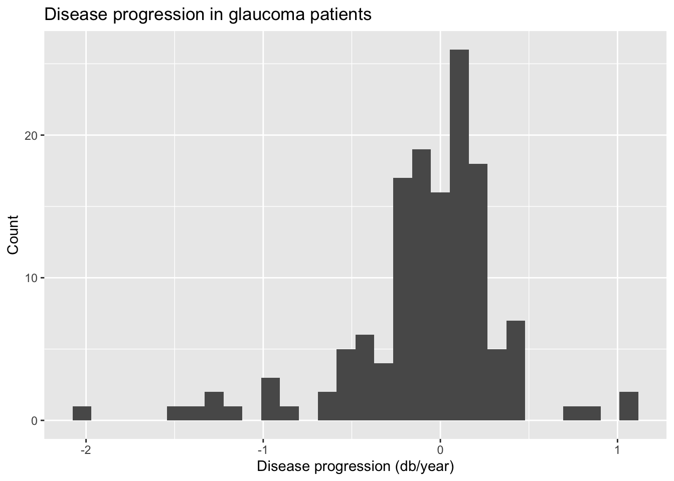 title = "Disease progression in glaucoma patients")`stat_bin()` using `bins = 30`. Pick better value with `binwidth`.