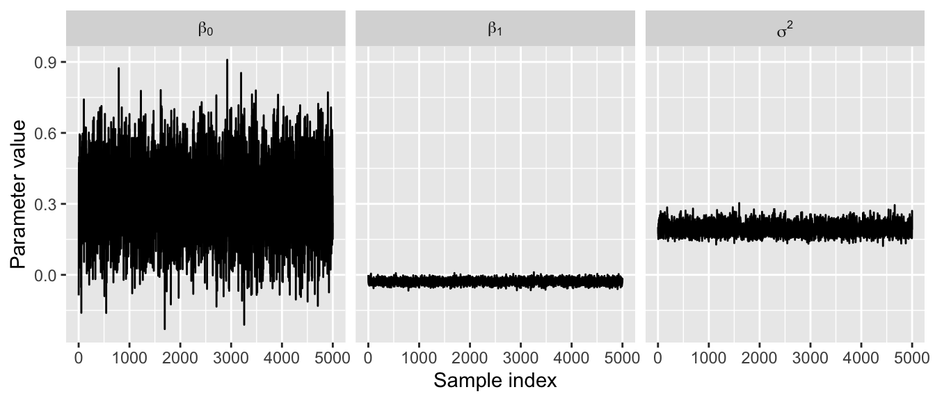 parameter = rep(c("beta[0]", "beta[1]", "sigma^2"), each = S),