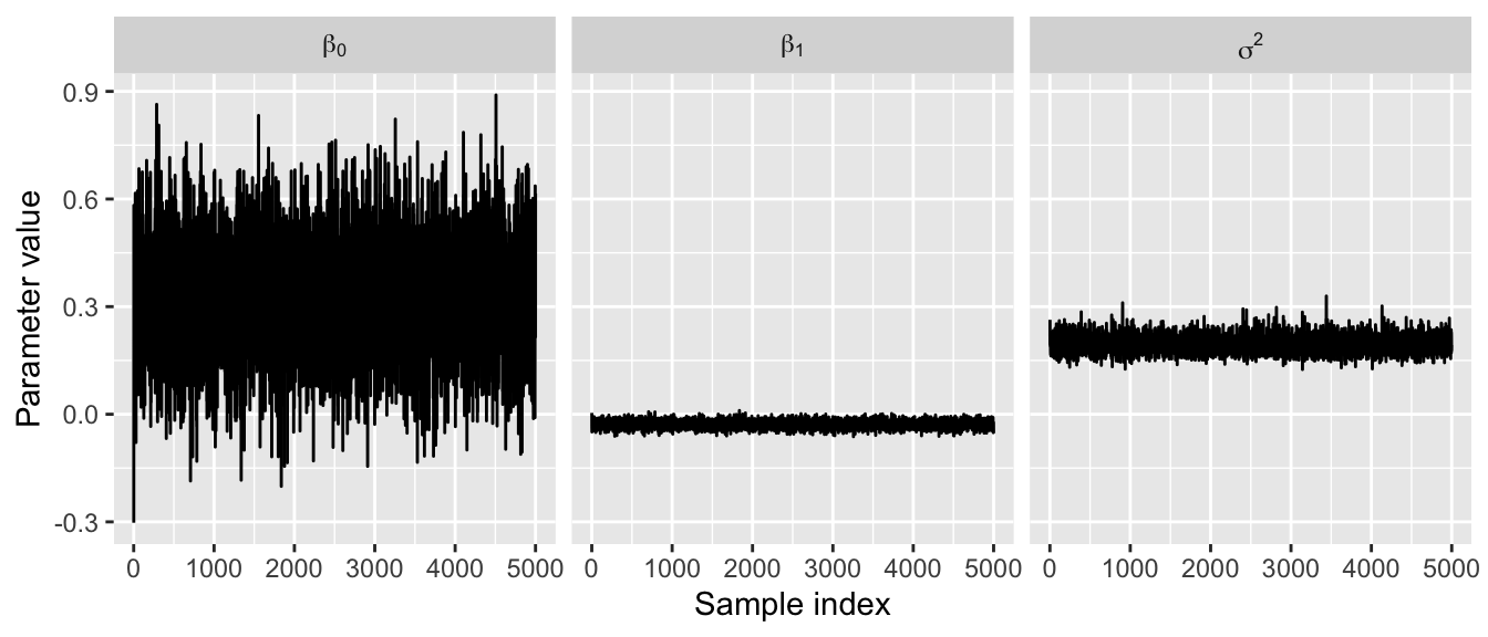 parameter = rep(c("beta[0]", "beta[1]", "sigma^2"), each = S),