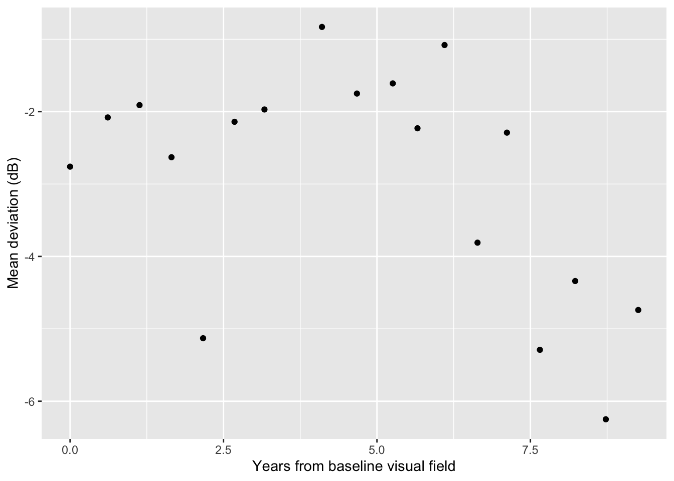 colnames(dat_pat) <- c("X", "Y")We can then visualize the longitudinal series of mean deviation values for eye 4.