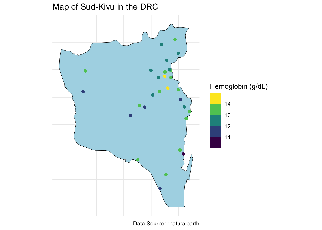 data_sf_drc <- st_intersection(data_sf, congo_states_map)We can now plot the average hemoglobin for each community.