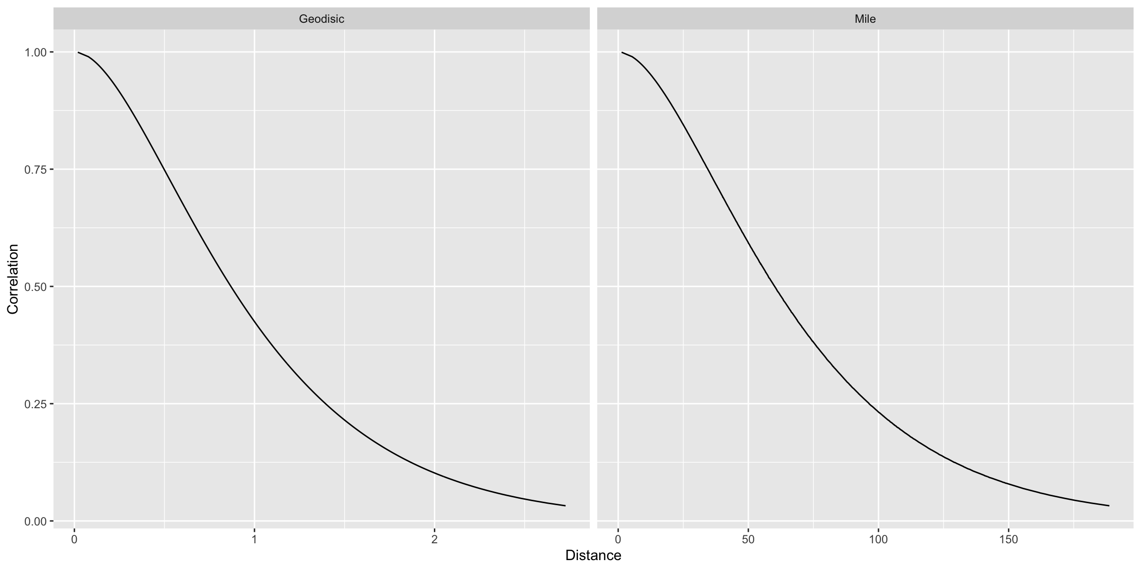 dists$correlation <- matern_3_2(dists$distance_geodisic, rho = rho_mean)Next we will use the geodist package to convert the geodisic distance of our observed locations to miles. Note that this function converts distance to meters by default, so we divide by 1,609 to get miles.