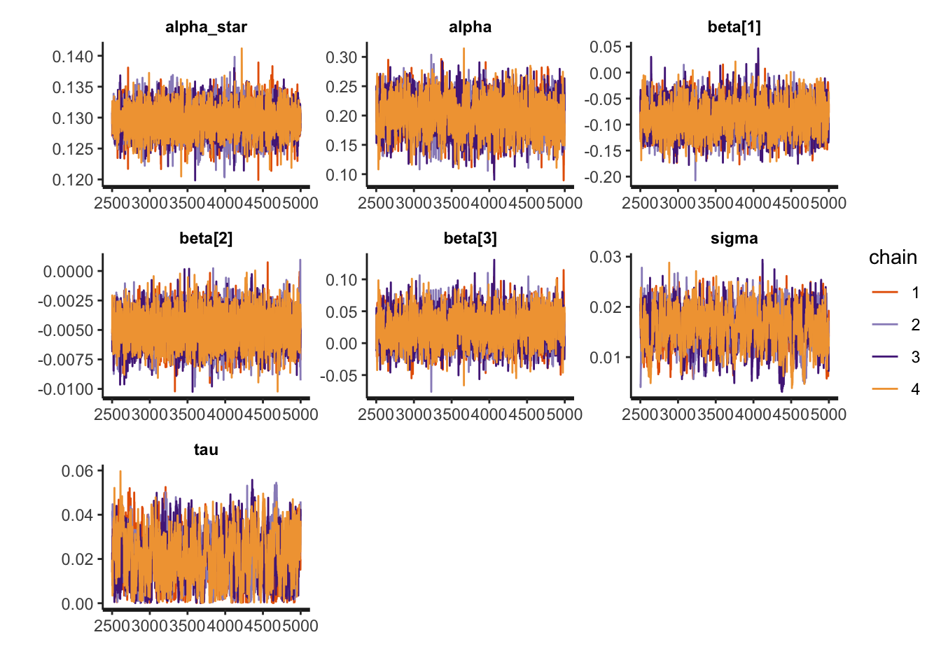 Note that I increased adapt_delta from its default of 0.8 to help with the convergence. We will can also look at traceplots, which look good. The number of effective samples is quite small for the variance parameters, which is a bit concerning, however since the R^ and traceplots look good, we can proceed with inference.