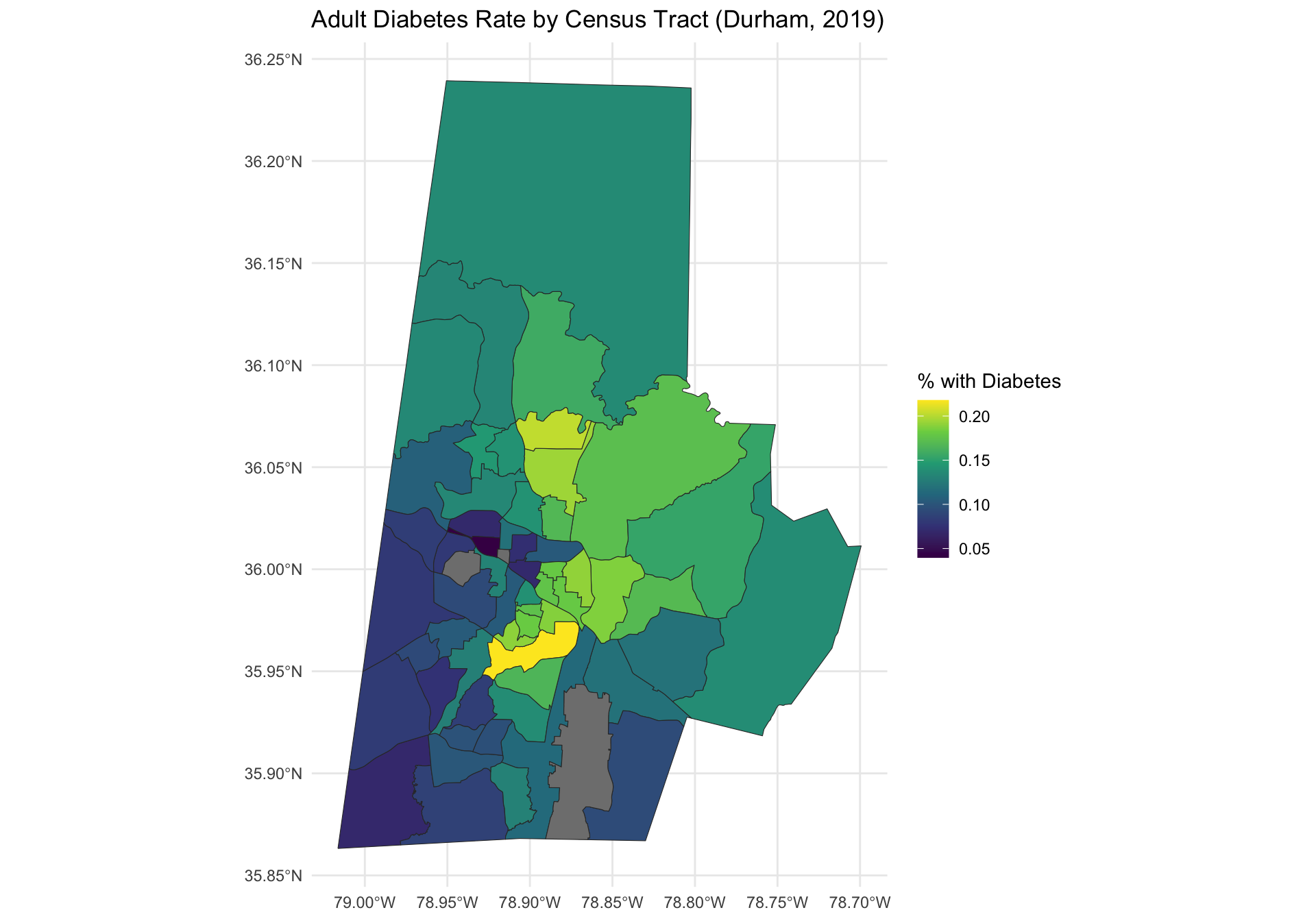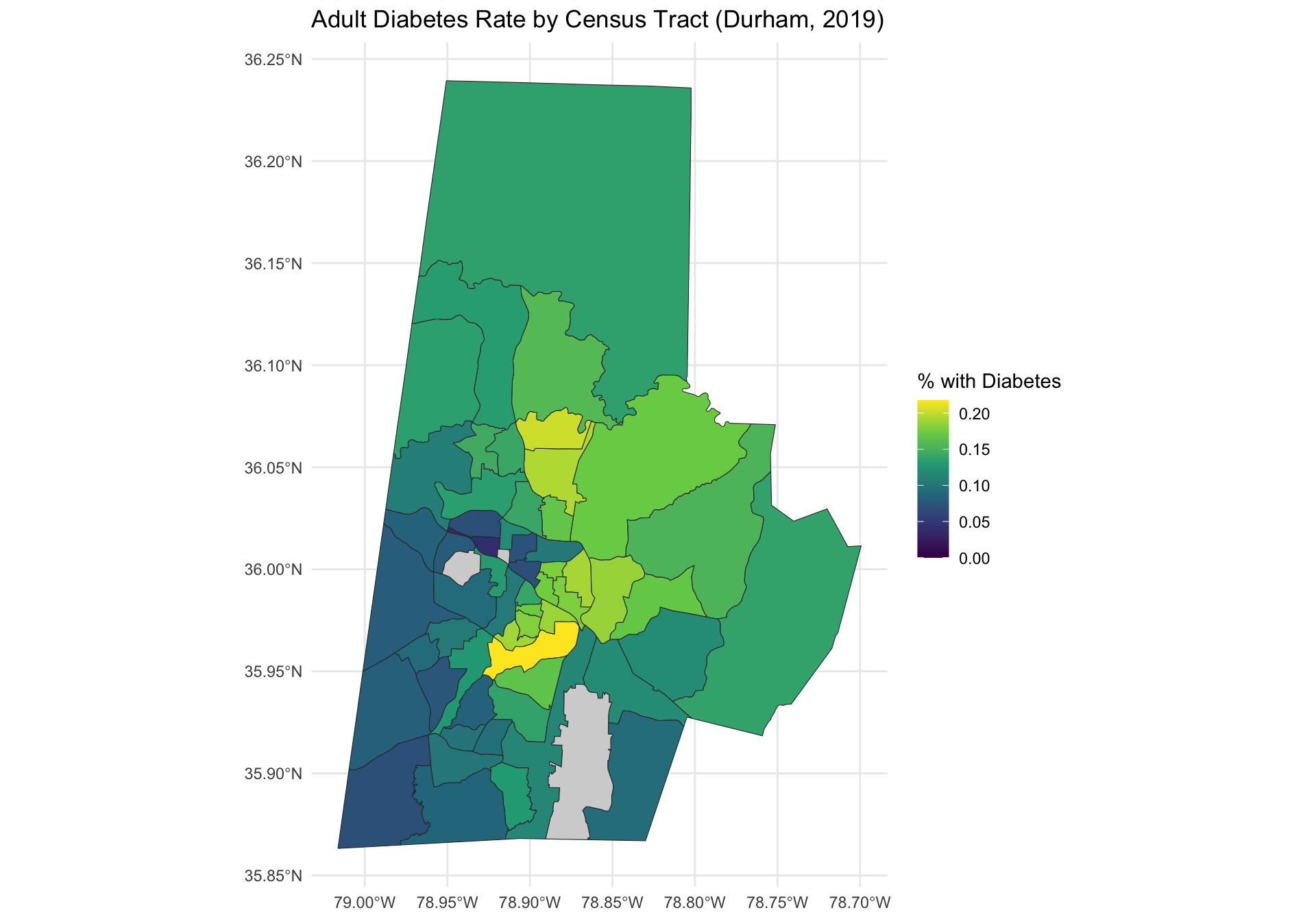 labs(title = "Adult Diabetes Rate by Census Tract (Durham, 2019)",