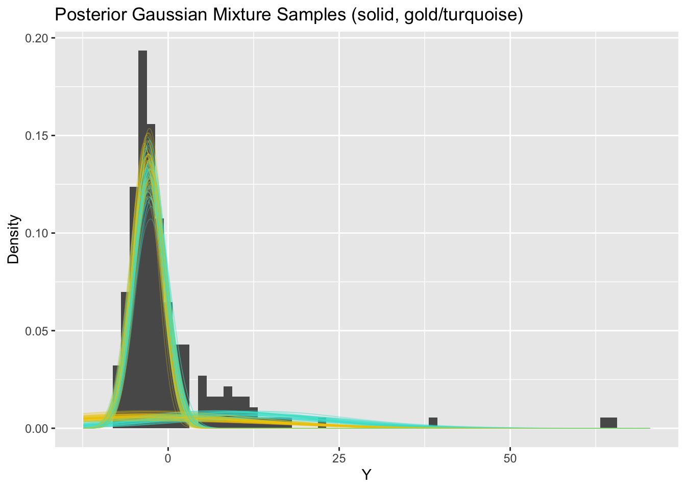 Hopefully students not that many of the marginal posteriors for Y_pred are well-behaved in terms of ESS and Rhat. Maybe we can estimate the density well without nailing the parameters. The density overlay is reasonable with obvious problems around the interval \((5,15)\).
