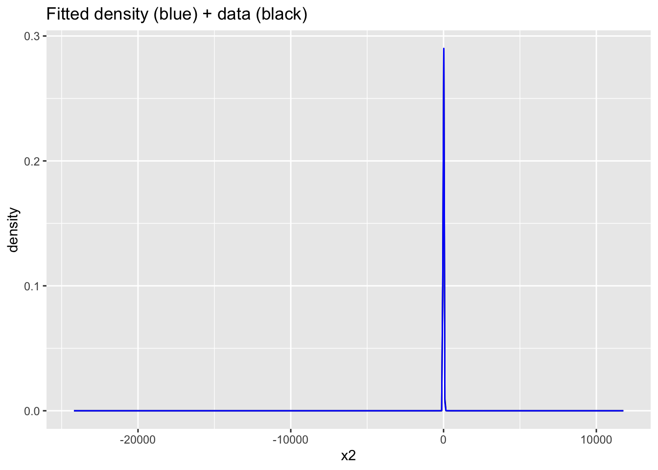 ggtitle("Fitted density (blue) + data (black)", subtitle = "Truncated to sample range")Warning: Removed 29799 rows containing non-finite outside the scale range