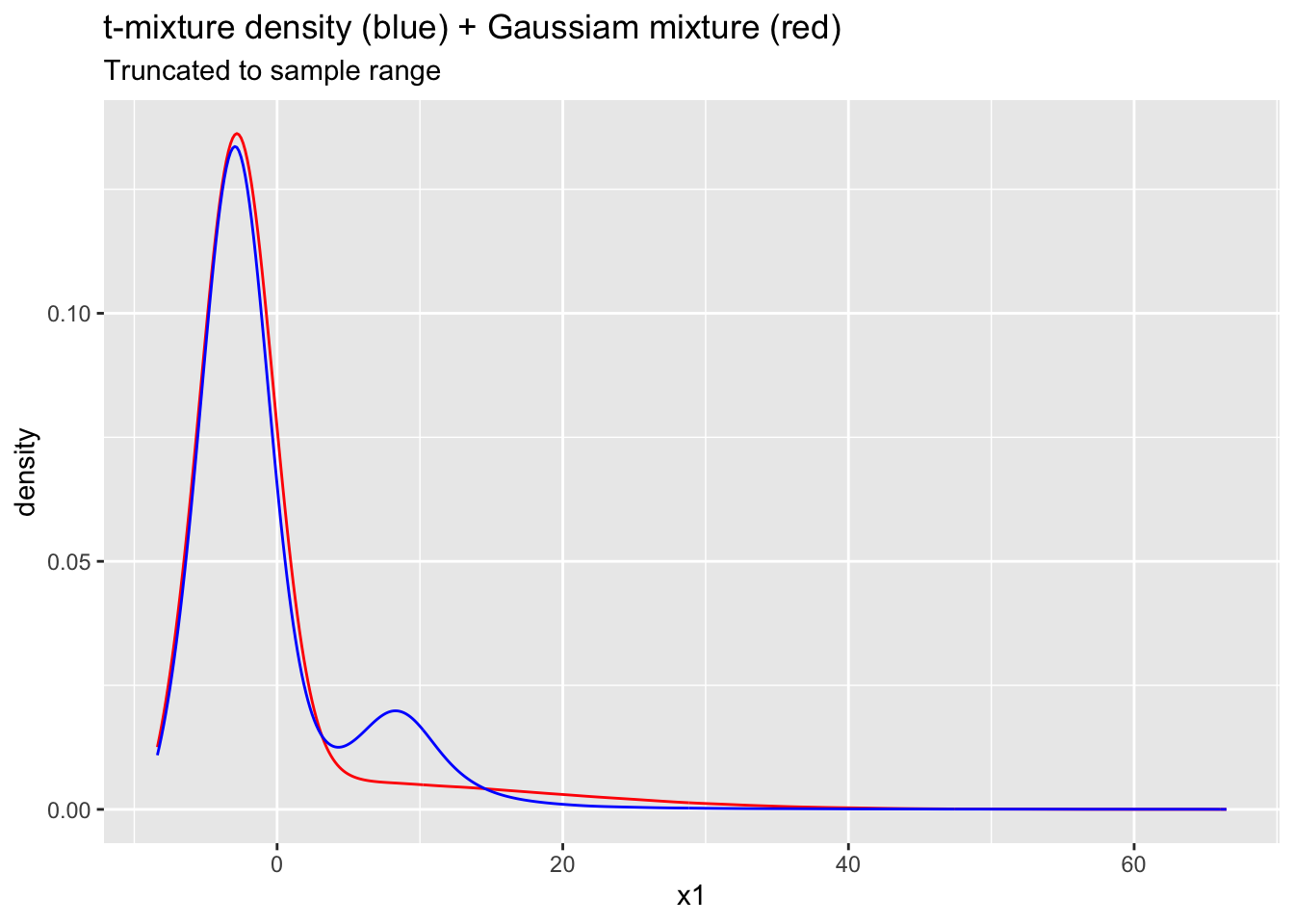 ggtitle("t-mixture density (blue) + Gaussiam mixture (red)", subtitle = "Truncated to sample range") +