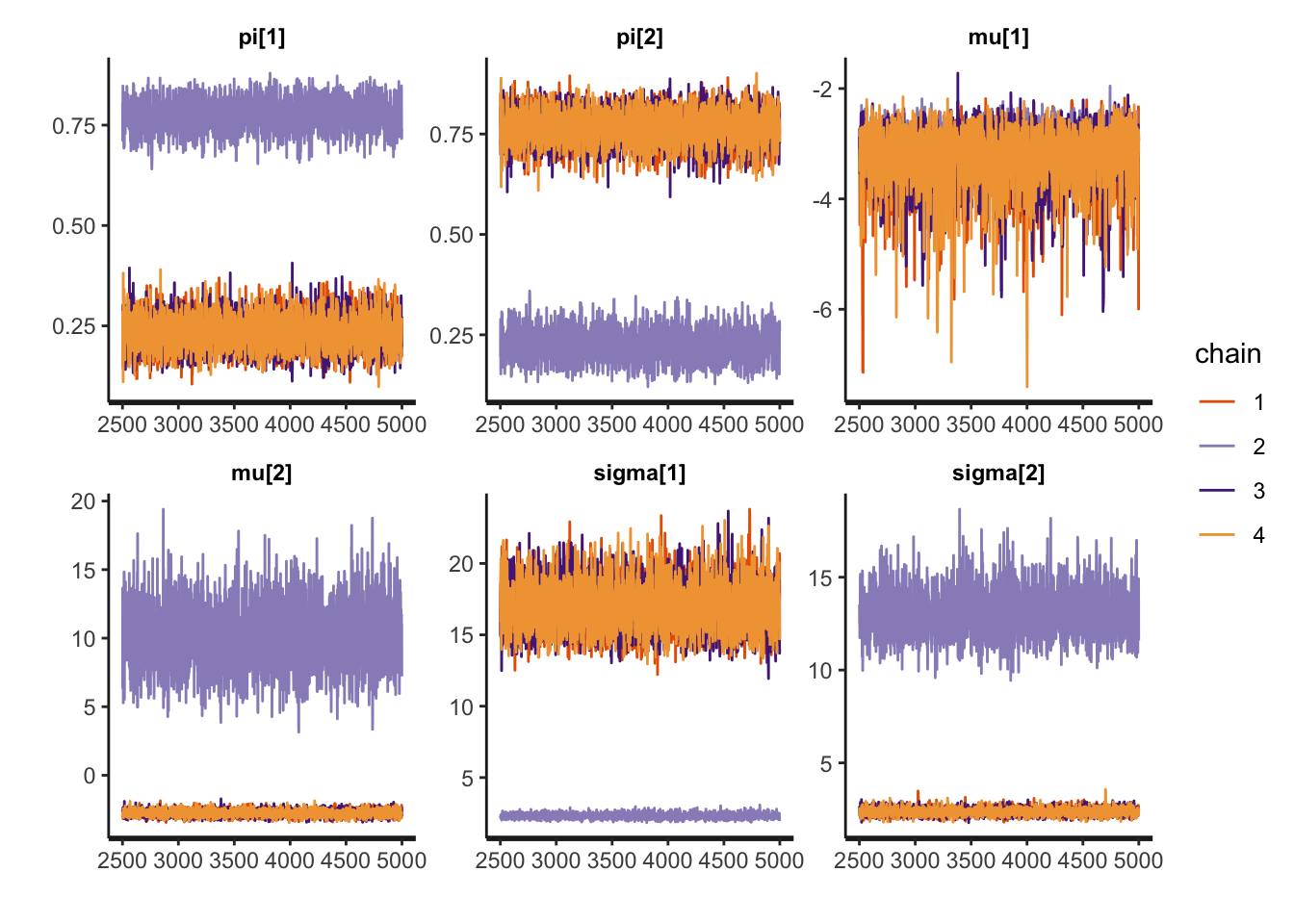 fit_mixture_k2g <- sampling(mixture_gauss, data=stan_data, iter=5000, chains=4, control=list("adapt_delta"=0.99))