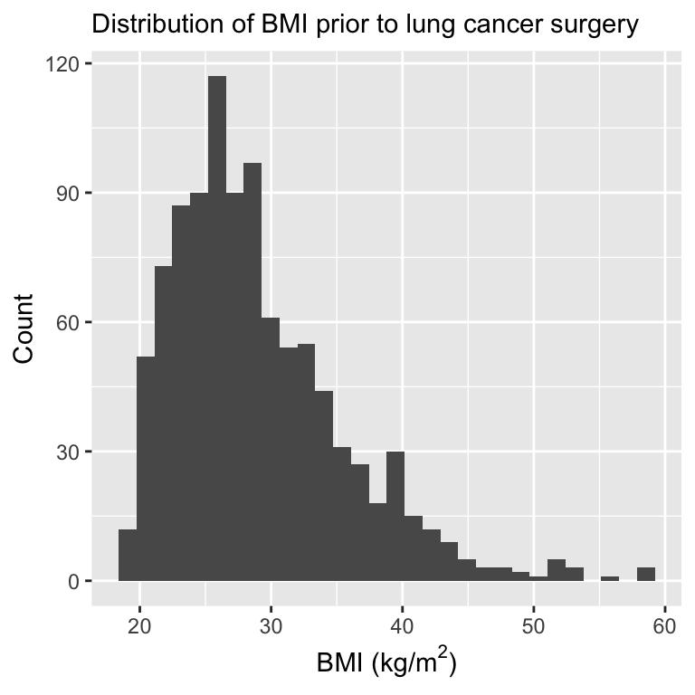 Age: continuous, age in years.Married: binary, married/living with partner of single.FamilyHx: binary (yes/no), does the patient have a family history (Hx) of cancer?SmokingHx: categorical with three levels, current smoker, former smoker, never smoked.Sex: binary (female/male).CancerStage: categorical with four levels, stages 1-4.LengthofStay: count number of days patients stayed in the hospital after surgery.WBC: continuous, white blood count.RBC: continuous, red blood count.BMI: body mass index given by the formula (\(kg/m^2\)).IL6: continuous, interleukin 6, a proinflammatory cytokine commonly examined as an indicator of inflammation, cannot be lower than zero.CRP: continuous, C-reactive protein, a protein in the blood also used as an indicator of inflammation.