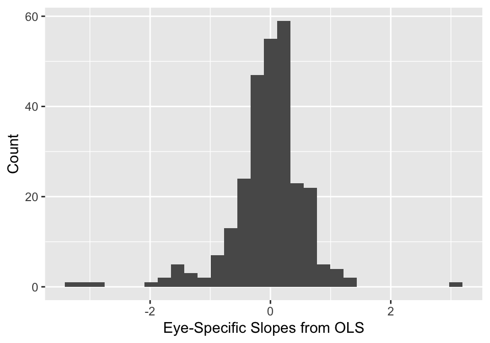 Define \(Y_{it}\) as the MD value for eye \(i\) (\(i = 1,\ldots,n\)) and visit \(t\) (\(t = 1,\ldots, n_i\)), and \(X_{it}\) is the follow-up time, such that \(X_{i0} = 0\). Researchers are interested in estimating the eye-specific slopes for our sample to identify which patients are progressing (i.e., slope less than 0). To estimate these eye-specific slopes, researchers would like to fit the following model: