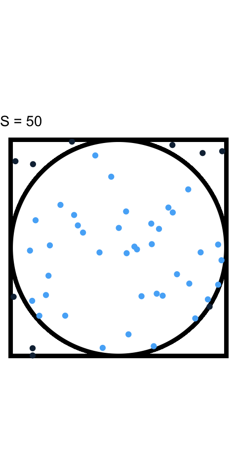 Imagine you randomly drop grains of sand into the area of the square. By counting the total number of sand grains in the square (all of them since you’re an accurate dropper) to the number of sand grains inside the circle we get this estimate.