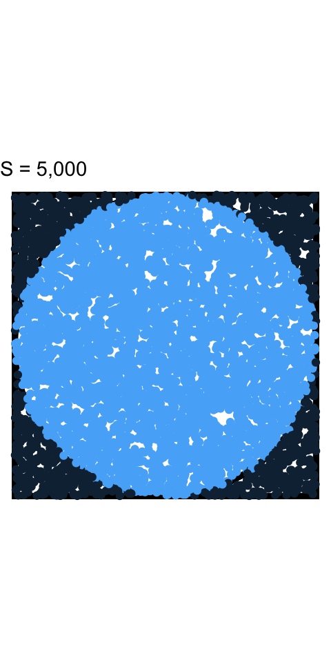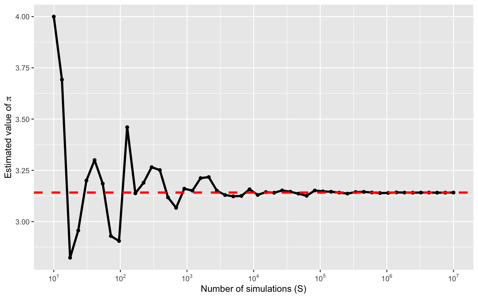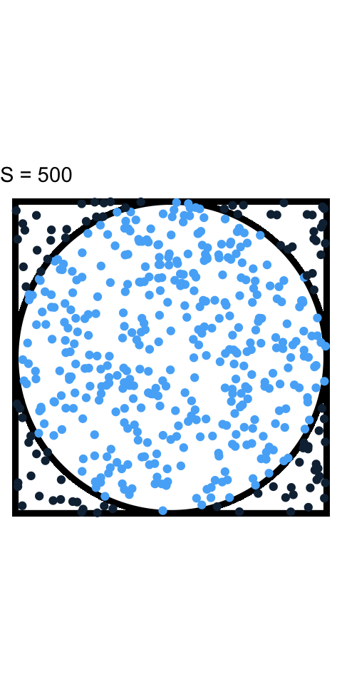 We then have that, \[\frac{1}{S}\sum_{i = 1}^S 1\left(X_i^2 + Y_i^2 \leq 1\right) \rightarrow \mathbb{E}_{X,Y}\left[1\left(X^2 + Y^2 \leq 1\right)\right],\]