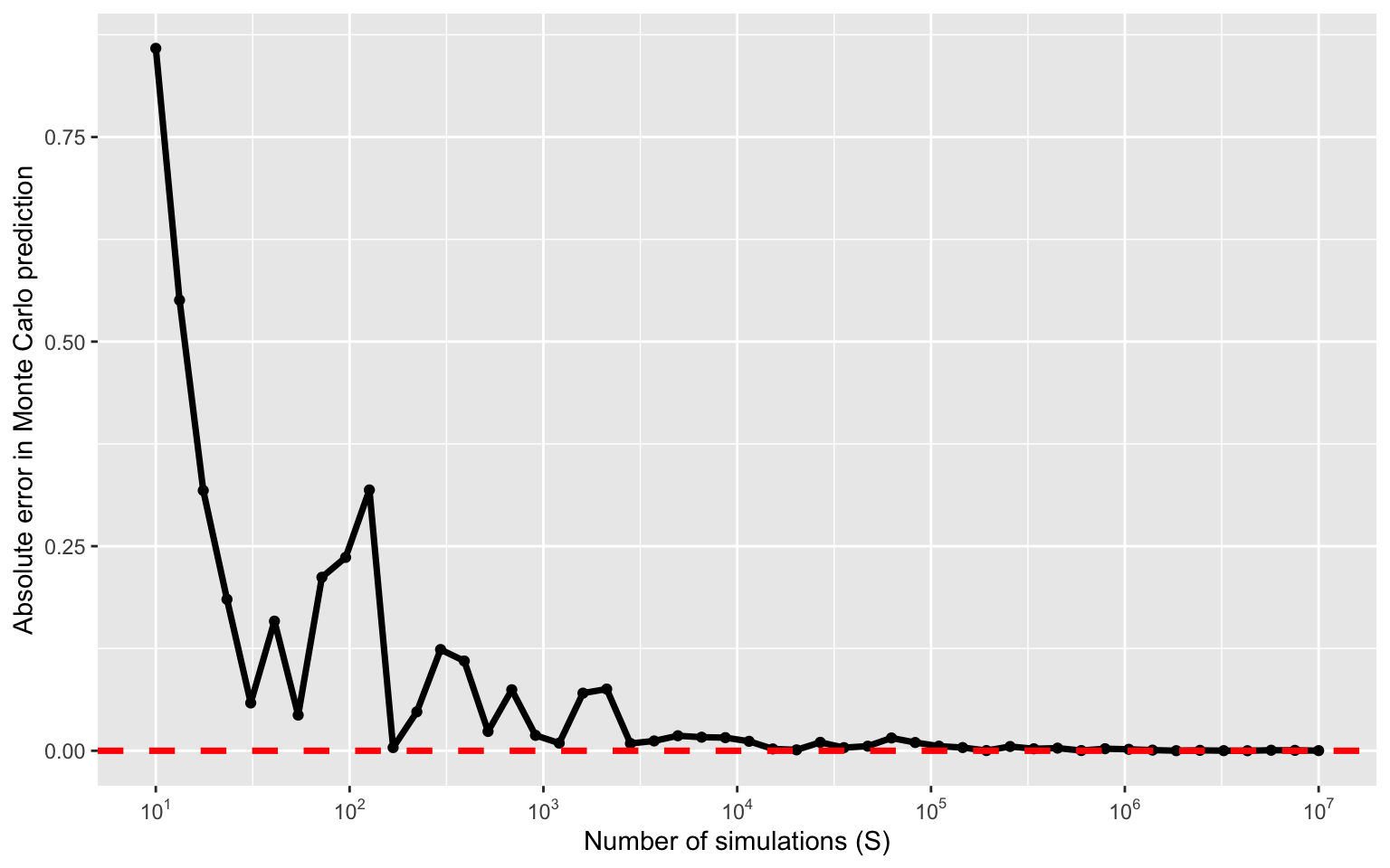 MC standard error: \(\sqrt{\frac{\widehat{\sigma}^2}{S}}\), \(\widehat{\sigma}^2=\frac{1}{S-1}\sum_{s=1}^S\left(\pi^{\left(s\right)}-\overline{\pi}\right)^2\)
