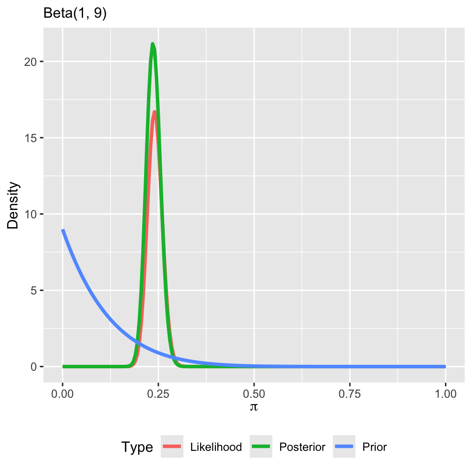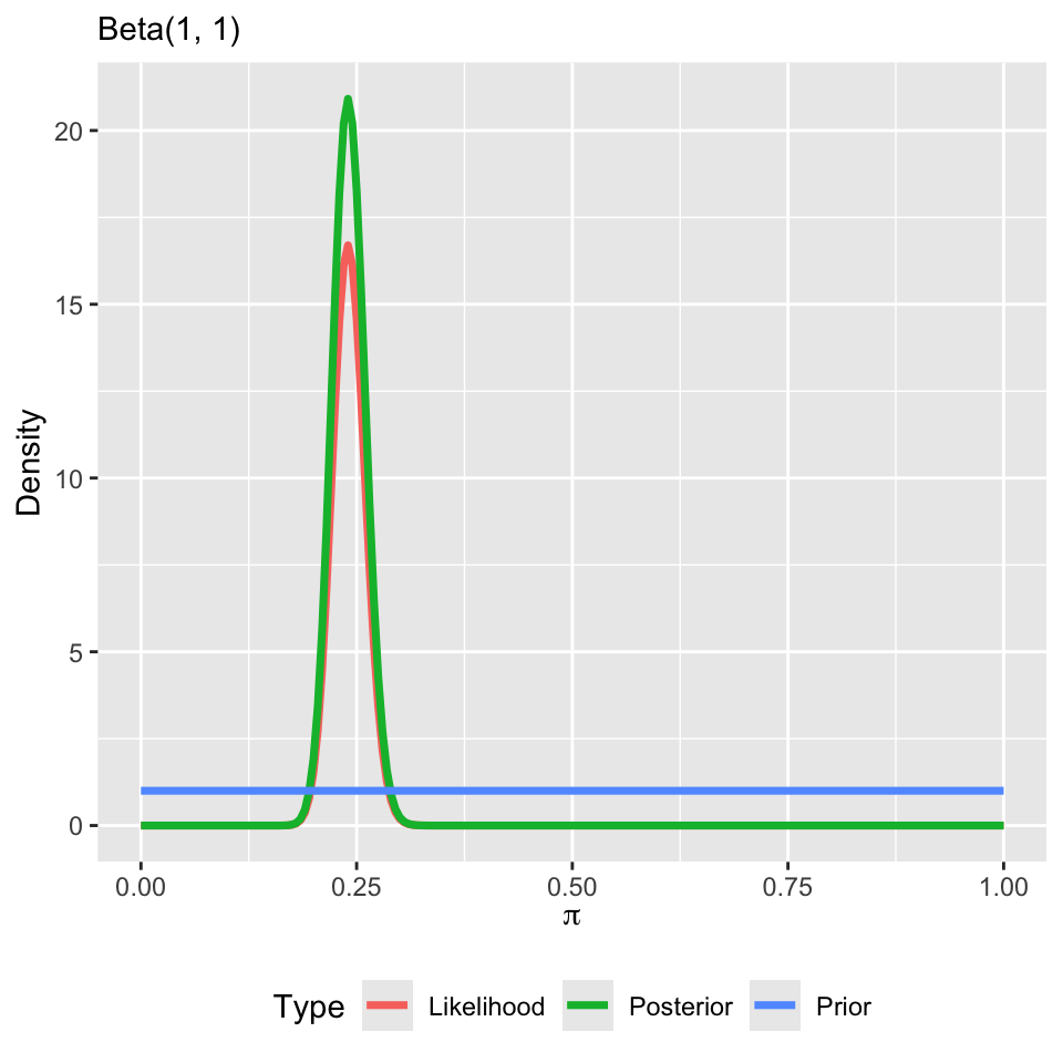Typically, \(\alpha = \beta = 1\), which corresponds to a uniform prior on \(\pi\).