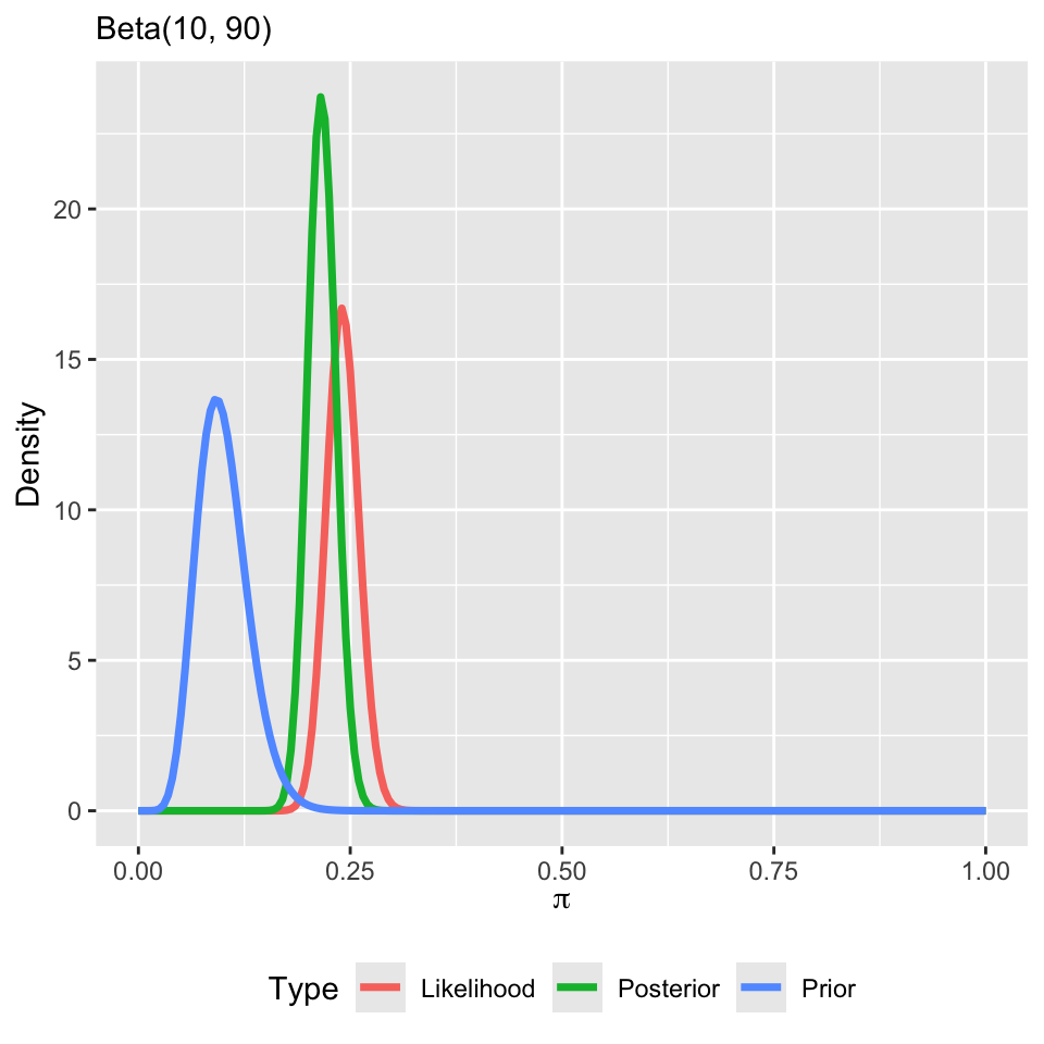 \[\begin{aligned} f(\pi | Z) &\propto f(Z | \pi) f(\pi)\\ &\propto \pi^z (1-\pi)^{n - z} \pi^{\alpha-1}(1-\pi)^{\beta-1} \\ &= \pi^{\left(\alpha + z\right) - 1} (1-\pi)^{\left(\beta + n - z\right) - 1}\\ &= Beta\left(\alpha + z, \beta + n - z\right). \end{aligned}\]
