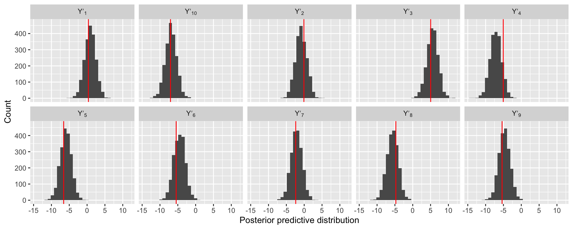 The posterior predictive distribution is defined as \(f(Y'|\mathbf{Y})\) and can be written as, \[\begin{aligned} f(Y' | \mathbf{Y}) &= \int f(Y' , \boldsymbol{\theta} | \mathbf{Y}) d\boldsymbol{\theta},\quad\text{(marginal)}\\ &= \int f(Y' | \boldsymbol{\theta},\mathbf{Y}) f(\boldsymbol{\theta} | \mathbf{Y})d\boldsymbol{\theta},\quad\text{(conditional)}\\ &= \int \underbrace{f(Y' | \boldsymbol{\theta})}_{likelihood} \underbrace{f(\boldsymbol{\theta} | \mathbf{Y})}_{posterior}d\boldsymbol{\theta}.\quad\text{(independence)} \end{aligned}\]