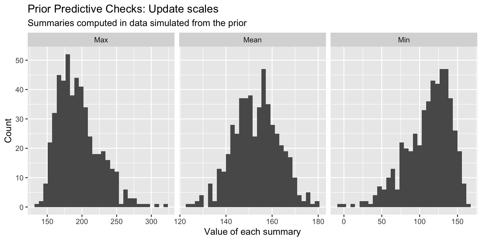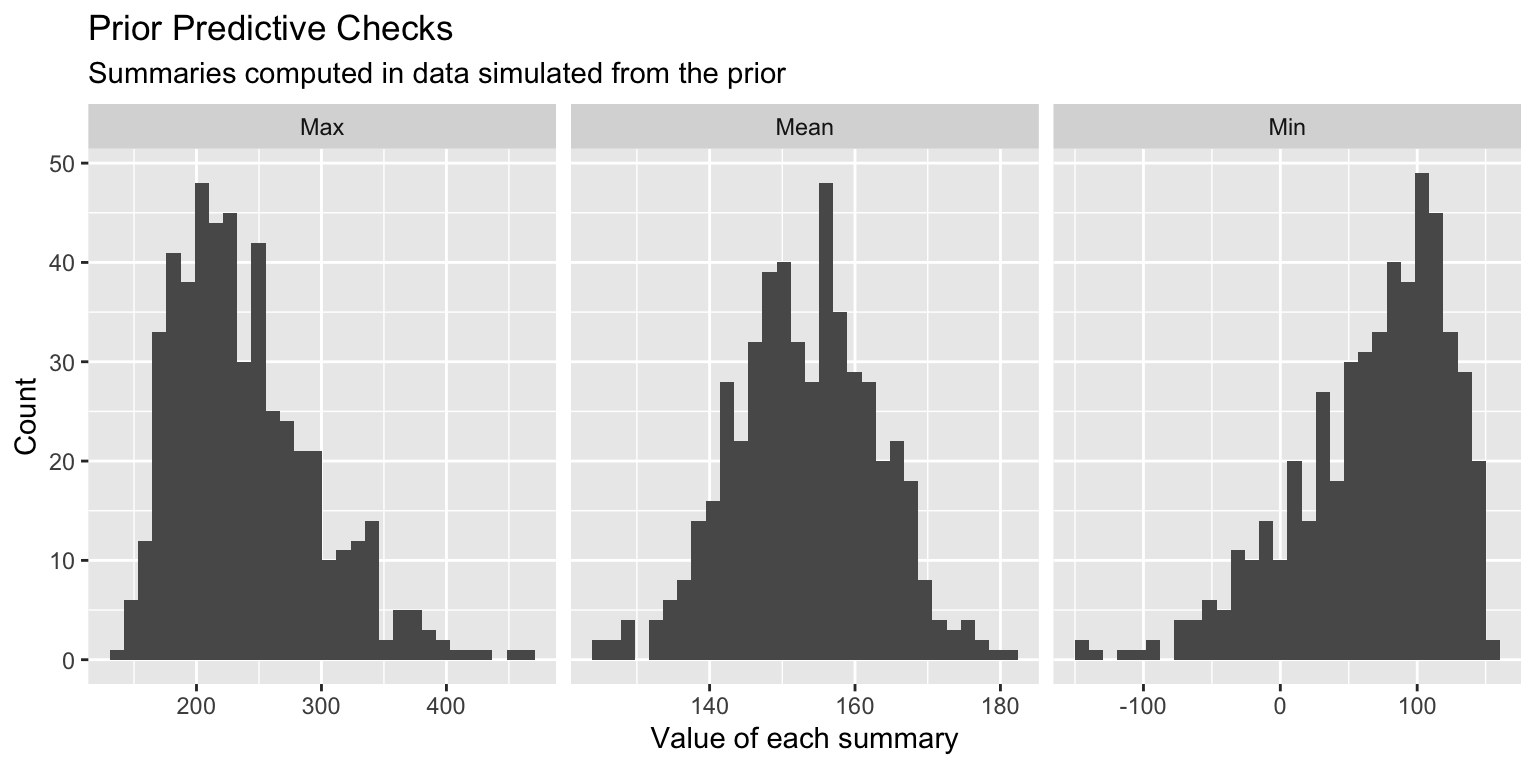 // stored in workflow_prior_pred_check.standata {int<lower = 1> n;int<lower = 1> p;real Y_bar;matrix[n, p] X;real<lower = 0> sigma_alpha;real<lower = 0> sigma_beta;real<lower = 0> sigma_sigma;}transformed data {row_vector[p] X_bar;for (i in1:p) X_bar[i] = mean(X[, i]);}generated quantities {// Sample from the priorsreal alpha_star = normal_rng(0, sigma_alpha);real alpha_plus = alpha_star + Y_bar;real alpha = alpha_plus - X_bar * beta;vector[p] beta;for (i in1:p) beta[i] = normal_rng(0, sigma_beta);real sigma = fabs(normal_rng(0, sigma_sigma));// Simulate data from the priorvector[n] Y;for (i in1:n) { Y[i] = normal_rng(alpha + X[i, ] * beta, sigma); }// Compute summaries from the priorreal Y_min = min(Y);real Y_max = max(Y);real Y_mean = mean(Y);}