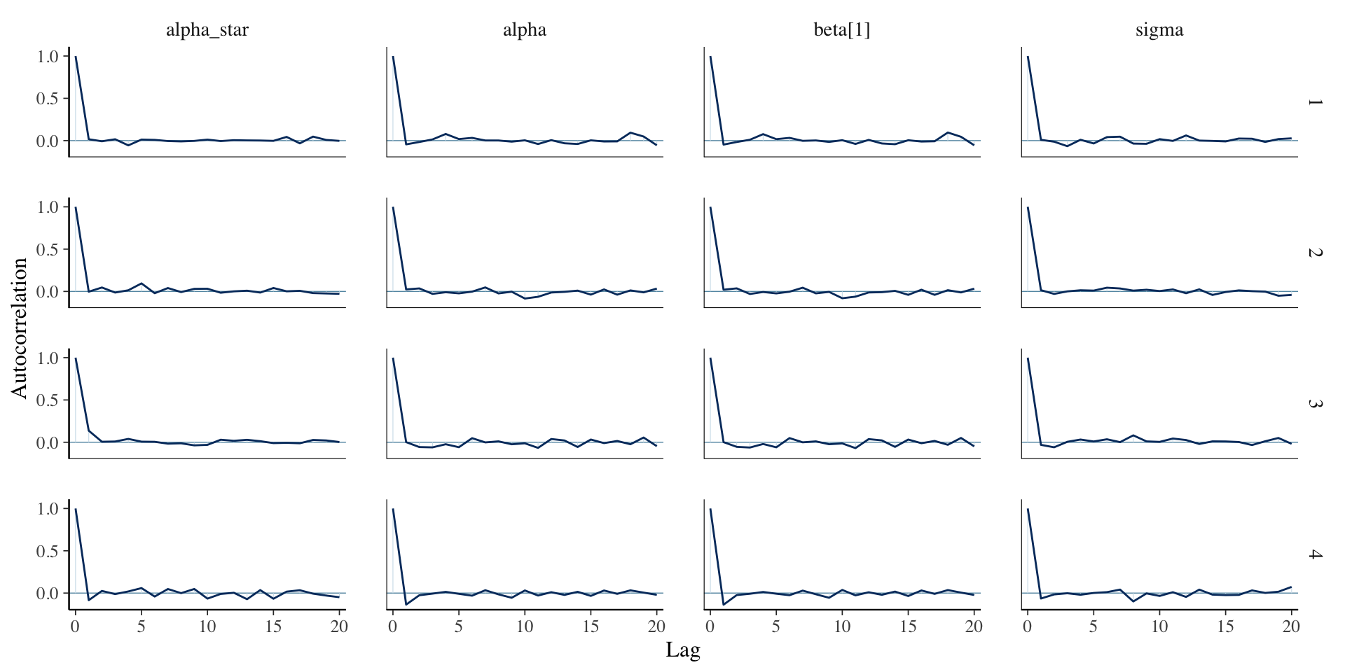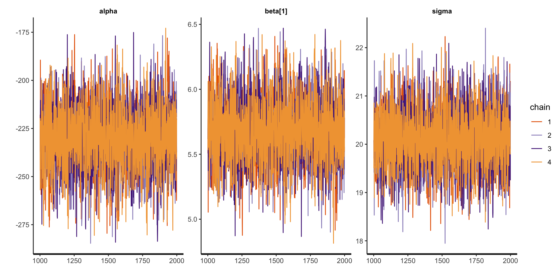 4 chains, each with iter=2000; warmup=1000; thin=1;
