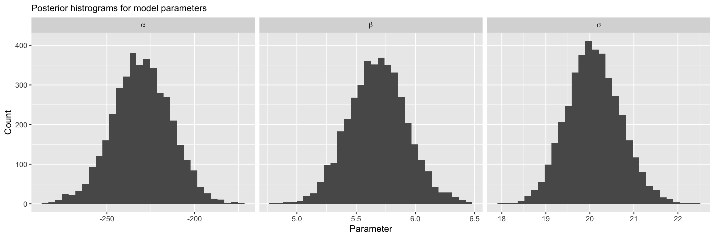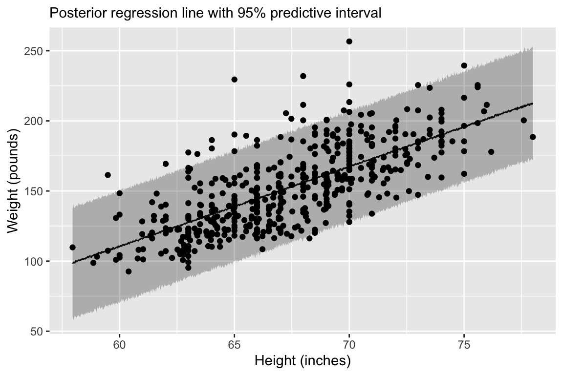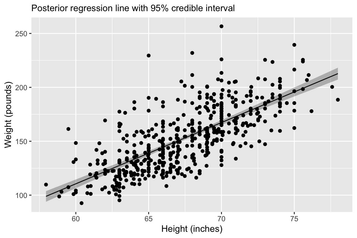 Regression line corresponds to posterior mean and 95% credible interval for \(\mu = \alpha + \mathbf{x}_i \boldsymbol{\beta}\).
