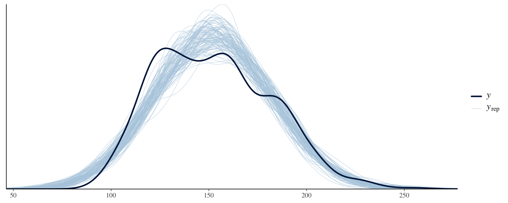 Y_pred <- rstan::extract(fit_workflow, pars ="Y_pred")$Y_predppc_dens_overlay(Y, Y_pred[1:100, ])