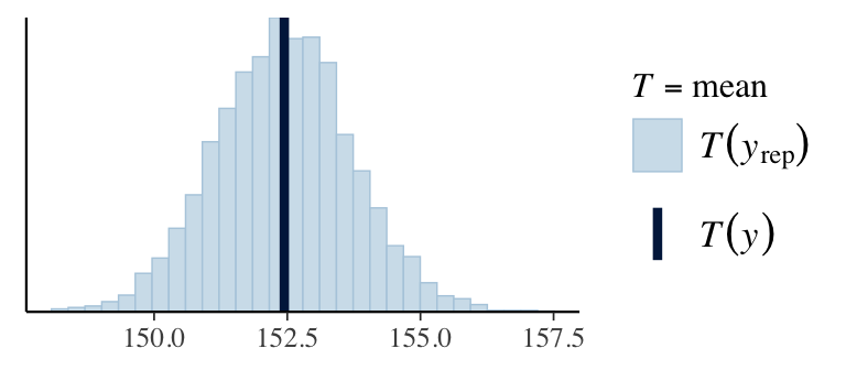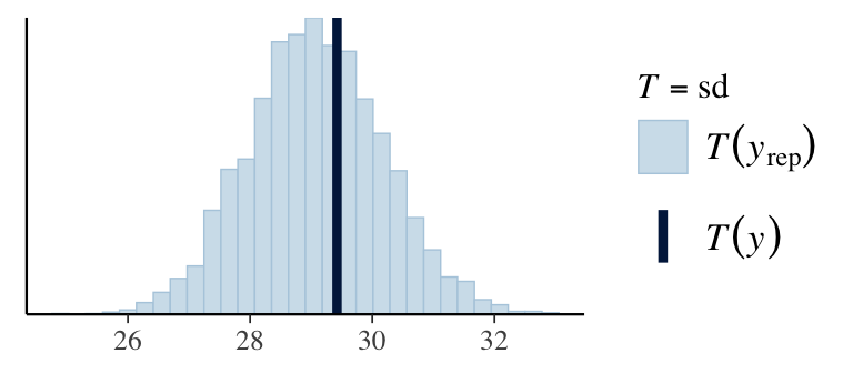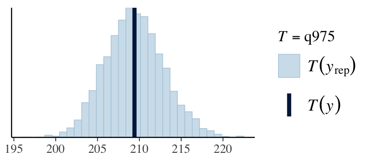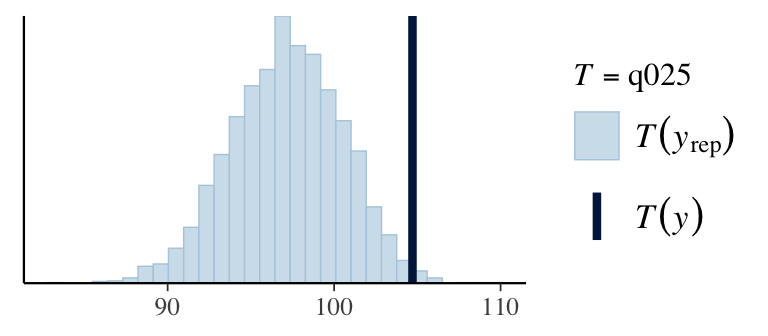 ppc_stat(Y, Y_pred, stat ="mean") # from bayesplotppc_stat(Y, Y_pred, stat ="sd")q025 <-function(y) quantile(y, 0.025)q975 <-function(y) quantile(y, 0.975)ppc_stat(Y, Y_pred, stat ="q025")ppc_stat(Y, Y_pred, stat ="q975")