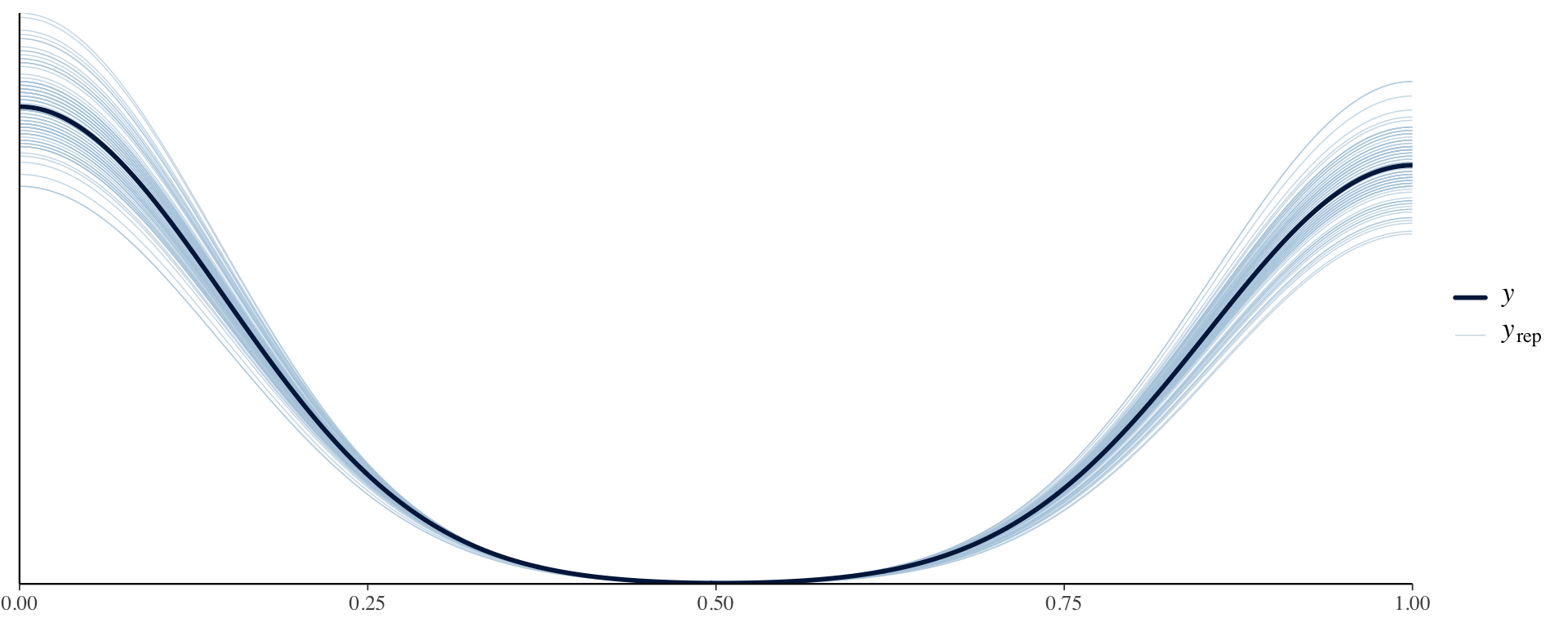 y_pred <- rstan::extract(fit, pars ="Y_pred")$Y_predppc_dens_overlay(stan_data$Y, y_pred[1:100, ])