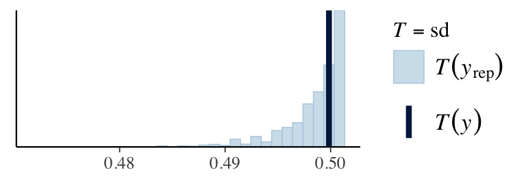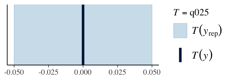 ppc_stat(stan_data$Y, y_pred, stat ="mean") # from bayesplotppc_stat(stan_data$Y, y_pred, stat ="sd")q025 <-function(y) quantile(y, 0.025)q975 <-function(y) quantile(y, 0.975)ppc_stat(stan_data$Y, y_pred, stat ="q025")ppc_stat(stan_data$Y, y_pred, stat ="q975")