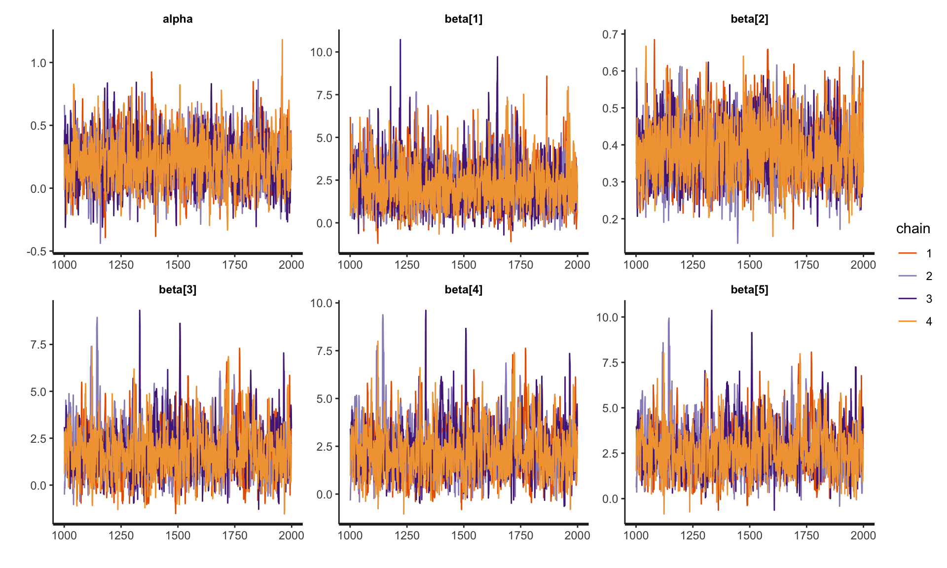 4 chains, each with iter=2000; warmup=1000; thin=1;