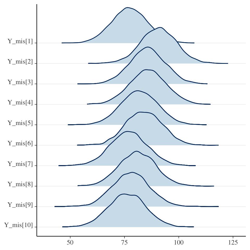 library(bayesplot)Y_mis <- rstan::extract(fit_full_bayes_joint, pars ="Y_mis")$Y_miscolnames(Y_mis) <-paste0("Y_mis[", 1:ncol(Y_mis), "]")mcmc_areas_ridges(Y_mis[, 1:10])