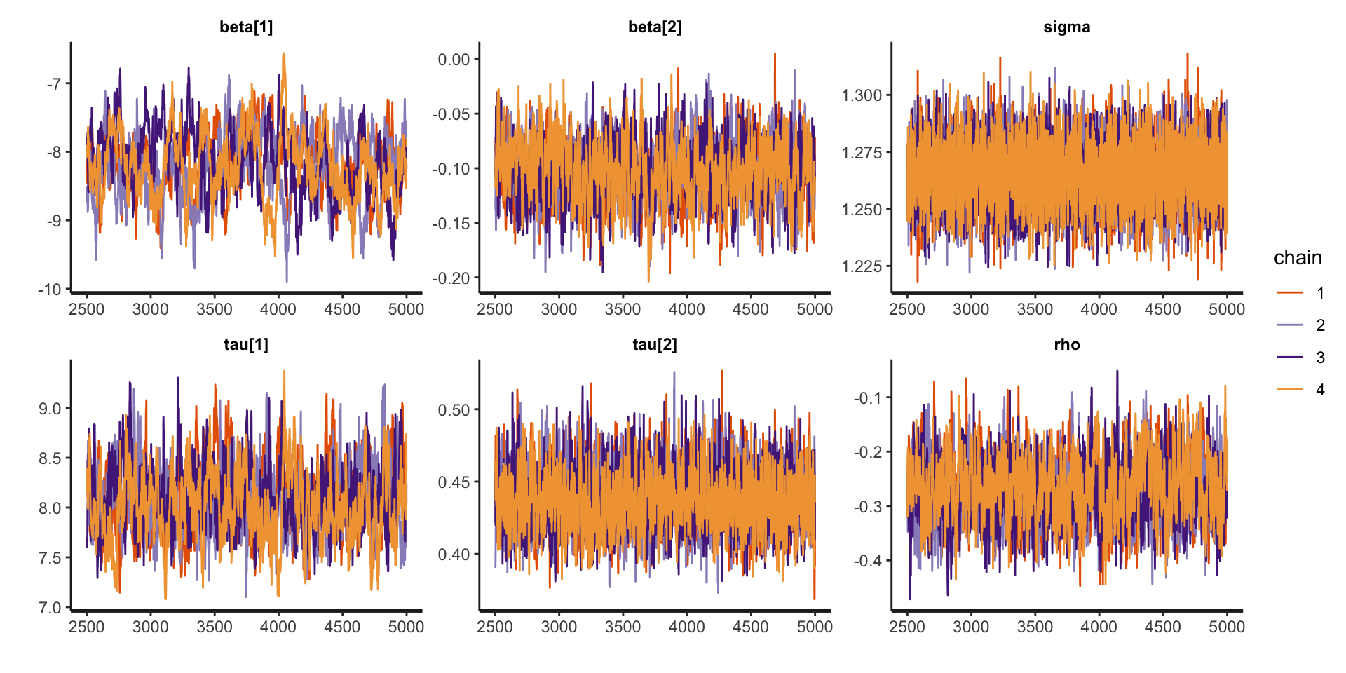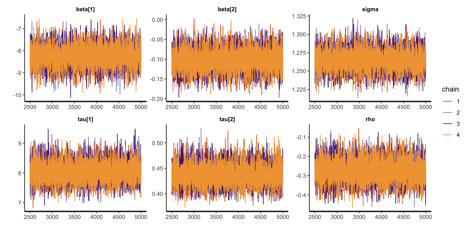 print (fit_lmm_conditional, pars = c ("beta" , "sigma" , "tau" , "rho" ))
