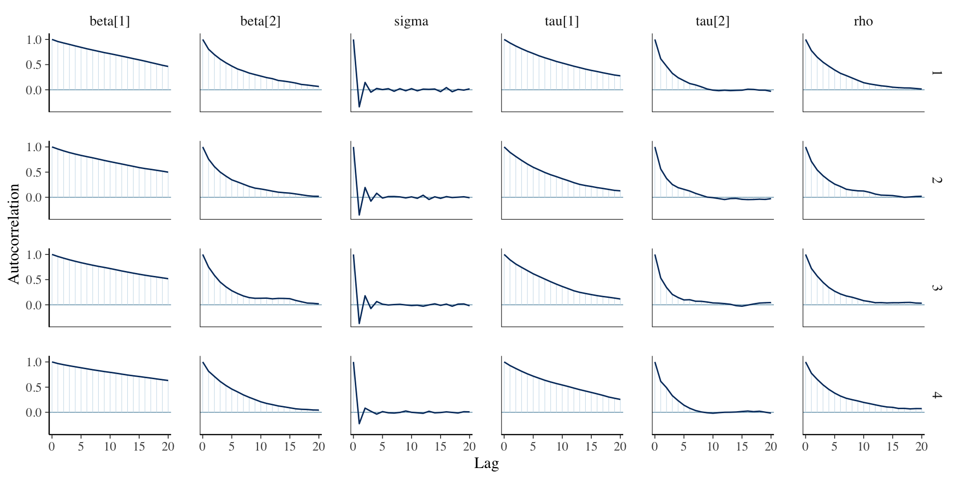 bayesplot:: mcmc_acf (fit_lmm_conditional, regex_pars = c ("beta" , "sigma" , "tau" , "rho" ))