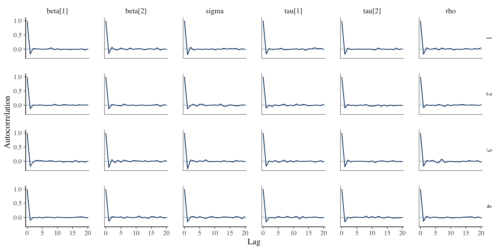 bayesplot:: mcmc_acf (fit_lmm_marginal, regex_pars = c ("beta" , "sigma" , "tau" , "rho" ))