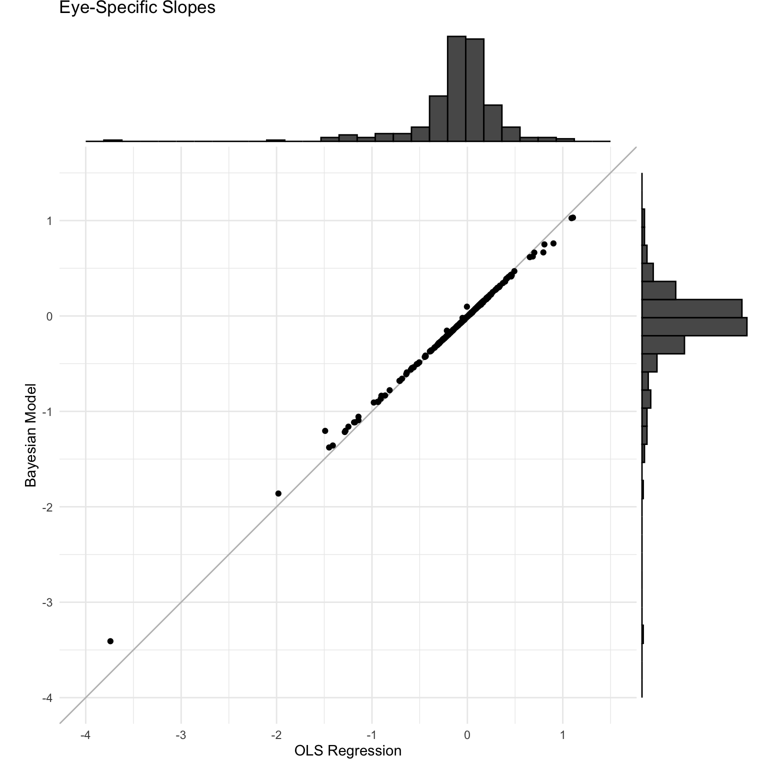 Estimating eye-specific intercepts and slopes within the context of the whole study sample should shrink extreme values toward the population average.
