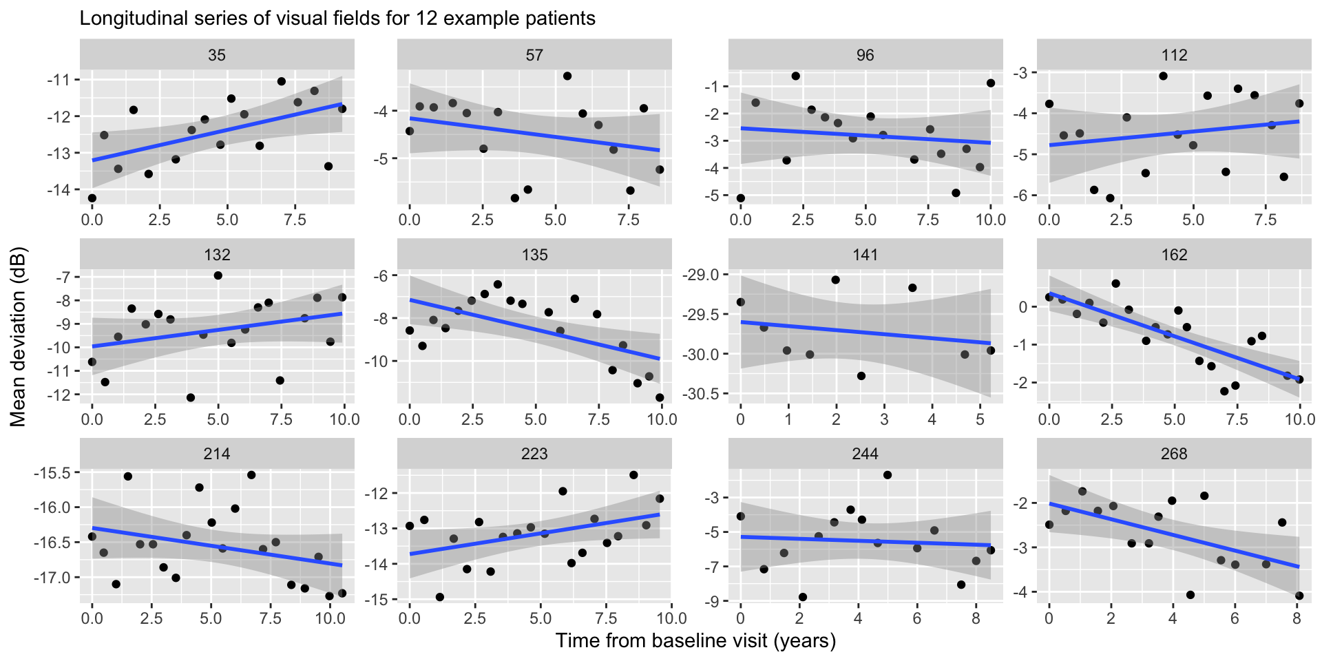 Imagine we are tracking mean deviation (MD, dB), a key measure of visual field loss in glaucoma patients, over time.